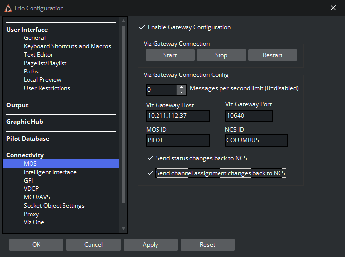 A Viz Gateway (MOS) connection allows Viz Trio to monitor rundowns from any Newsroom Computer System (NCS) that supports the Media Object Server (MOS) protocol.