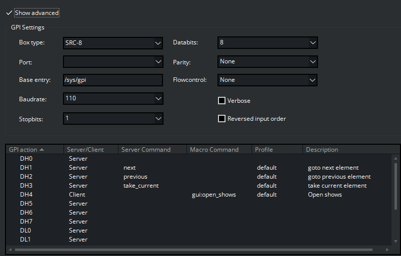 Port: Sets the port that the GPI box is connected to. The Port can be set to COM1-COM17, or None.