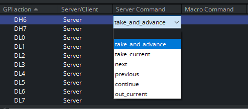 Server Command: Double click to show a drop-down list box in every row, where the action to be performed on this GPI line can be selected.