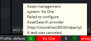 If the configuration is not working properly, the Viz One icon is red. Scenarios where the icon is red can for example, be a Viz One-search that fails, or a more serious error, a non-responsive Viz One with no video playout. In such serious situations where Viz One is unavailable, an error message is displayed, stating that videos that have already been transferred to Viz One still work, but new videos are not transferred.