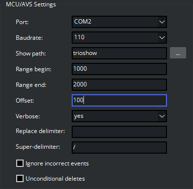 To view the MCU/AVS configuration settings, click Connectivity > MCU/AVS in the Viz Trio Configuration.