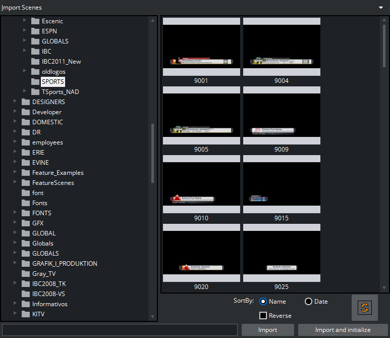 Select scenes to import into the template list and click Import. You can select multiple scenes and import scenes from any scene folder. To quickly make the scenes ready for playout, click Import and Initialize, this loads all scenes on the program and preview renderer (Viz Engine).
