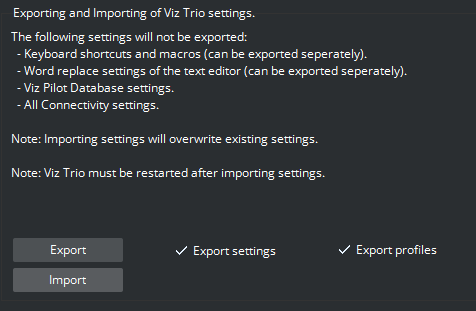 This function lets you import and export the configuration settings from and to an XML-file, letting you apply customized settings to Viz Trio clients without manually configuring the settings each time.