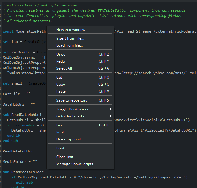 Save script: Saves a script to the server. You can also save the script by right-clicking inside the script window and selecting Save to repository from the Context Menu, where you can also save units to file.