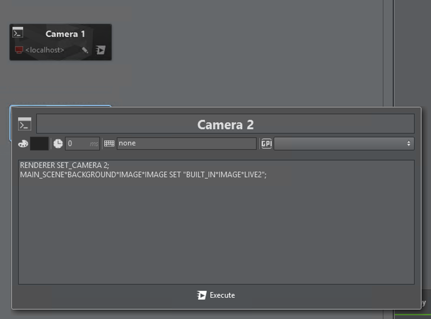 RENDERER SET_CAMERA 1;MAIN_SCENE*BACKGROUND*IMAGE*IMAGE SET "BUILT_IN*IMAGE*LIVE1";RENDERER SET_CAMERA 2;MAIN_SCENE*BACKGROUND*IMAGE*IMAGE SET "BUILT_IN*IMAGE*LIVE2";