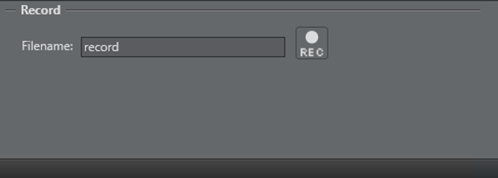 The Record tab is used to start or stop the recording of a new clip. If not recording, a clipname can be entered in the filename field. The filename is then extended by the channel recorder plug-ins and used for the new clip. Pressing on the REC button starts recording.