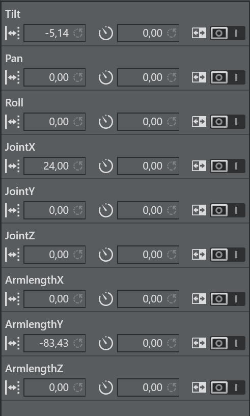 The Translation rig is mostly used as parent rig to an Arm or CraneArm Rig. It lets you modify the position of all child rigs. PosX, PosY and PosZ can be used to track the position. It is a usual element in a Spidercam setup.
