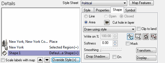 As well as constructing drawings out of shapes in separate shape layers, you can also add shape overlays to map layers. Shapes drawn on a map layer appear in the Details list on the layer’s Contents panel and are referred to as shape overlays. They include all the same features as shapes drawn in shape layers with some extra features that make them particularly useful for highlighting areas on maps: