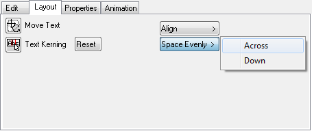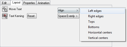 The options on the Layout panel (depicted above) allow you to move, scale, or rotate a text item, adjust the kerning, or align or space evenly multiple text items.