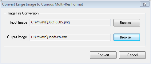 On the Tools menu, click Convert Large Images.... The following dialog box allows you to specify the image to convert, and a filename for the CMR (Curious Multi-Res) image: