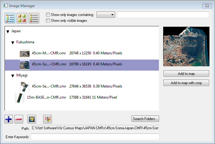 The Convert Multiple Images tool allows you to convert a number of adjacent geo-referenced images into a single large image, in CMR (Curious Multi-Res) format.