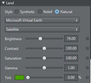 Natural sea enables you to select which satellite imagery provider to use (for example, Google Maps, Microsoft Virtual Earth, Digital Globe, Planet Observer, and so on). In addition you can adjust the map’s brightness, contrast, saturation, gamma, and tint.