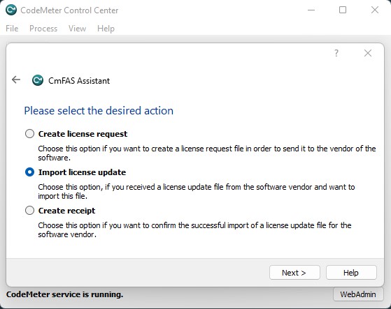 Copy the downloaded License Update file to the remote computer and open CodeMeter Control Center. Click License Update again and then select Import license update.