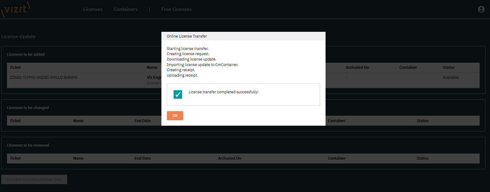 6. Pressing OK returns the portal to the Licenses.