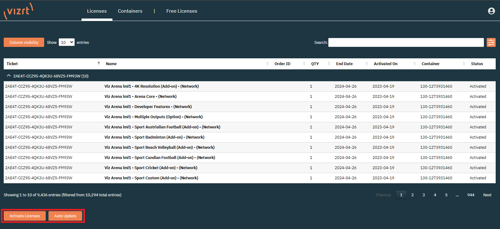 On the licenses page, below the license information, there are the Activate Licenses and Auto Update buttons.
