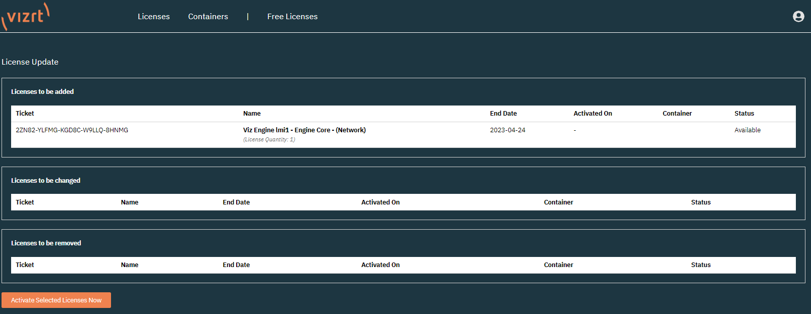 The summary page shows the licenses that are going to be added, changed or removed. For the activation process, licenses are added.