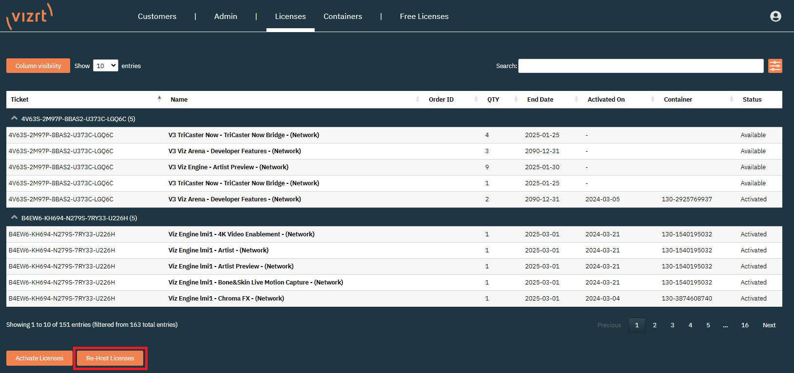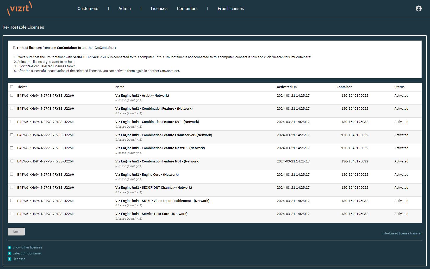After clicking the Re-Host Licenses button, a list of licenses available for rehost is displayed.